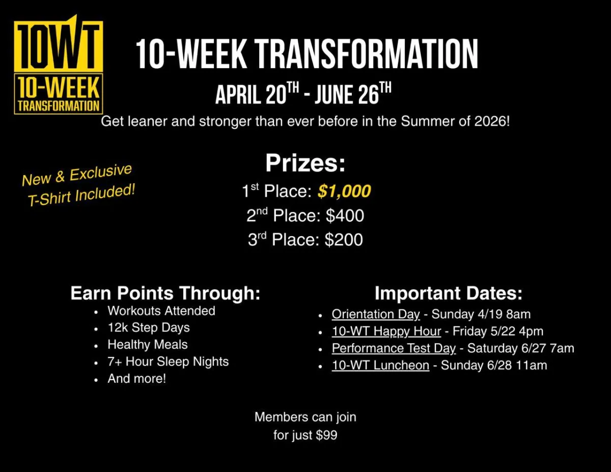 The 10-WT Challenge is open to all members and non-members. Best You Members will pay a one-time $159 registration fee (normal membership fees still apply). Non-Members will pay the full price of the 10-WT seen on the next page (payment options available).